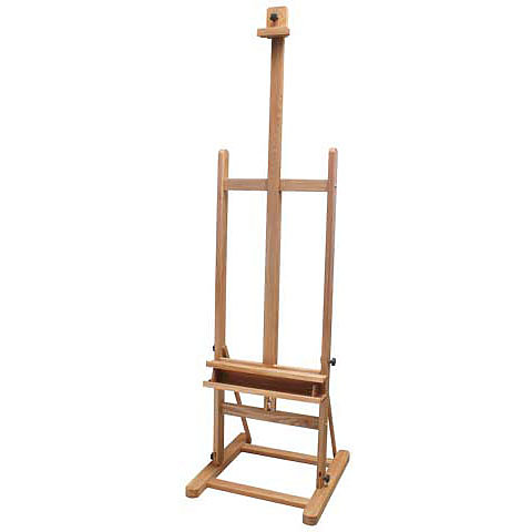 Constructed of hand-finished beechwood, this classic studio easel features a stable H-frame design and adjustable incline and height controls. Accommodates canvases up to 50", and includes a shelf for supplies. The height adjusts from 69.5"-96" and the base measures 21.5" square. Weighs 15 lbs. and folds flat for easy storage. Assembly required. Instructions are included.