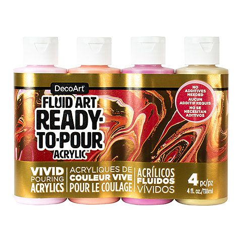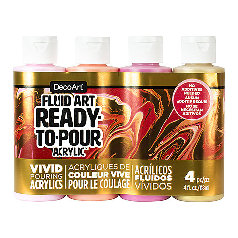 Fluid Art Ready-to-Pour Sets Fluid Art Ready-To-Pour Acrylic sets contain specially selected color palettes to create beautiful paint pours every time. Fluid Art Ready-To-Pour vibrant, highly pigmented colors are ready-to-use straight out of the bottle. No additives needed. Specially formulated to flow easily across the surface. Each set contains four 4 oz. bottles of paint to make paint pouring easy, convenient and affordable. Approximately 6-oz. of paint covers one 12" x 12" surface.