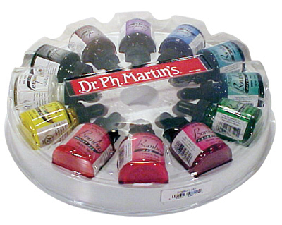 Colors are lightfast, transparent, fine art quality watercolor in a glass bottle. This liquid product delivers the same brilliance and permanency as traditional tube watercolors. Made from the finest artist pigments, Dr. Ph. Martin's Hydrus Fine Art Watercolor can be blended and intermixed while still maintaining the transparency and luminosity of the colors. Each set comes in a tray that doubles as a mixing palette and bottle holder, with space for a water cup and twelve individual mixing wells. Great for use in technical, calligraphy, fountain pens, and in airbrushes. Set includes 12 different colors in 1.0 oz (30 ml) glass bottles with droppers and a custom mixing palette.