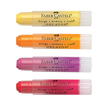 Gelatos are a multi-purpose mixed media medium. Compact, acid-free pigment sticks glide on creamy smooth for vibrant color and coverage. All Gelatos blend easily with or without water and you can transform opaque Gelatos Colors into translucent tints or mists with water. They are excellent for adding color and sheen to any surface, including paper, canvas, chipboard, wood, fabric, ribbon, journal boards and much more.