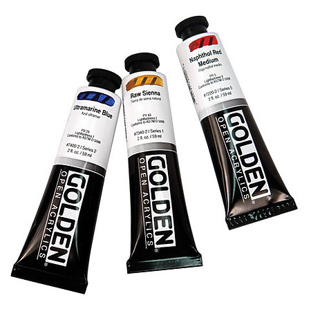 OPEN Acrylics feature uniquely relaxed working characteristics and a remarkable ability to resist skinning and remain wet on the palette during long painting sessions. Working time varies according to how thickly the material is applied. Thin applications tack up, allowing additional layers to be applied and blended. Thicker applications may be worked for hours. They are versatile and can be used for techniques where acrylics are normally challenging to use including portraiture, plein air painting, monoprinting and screenprinting.