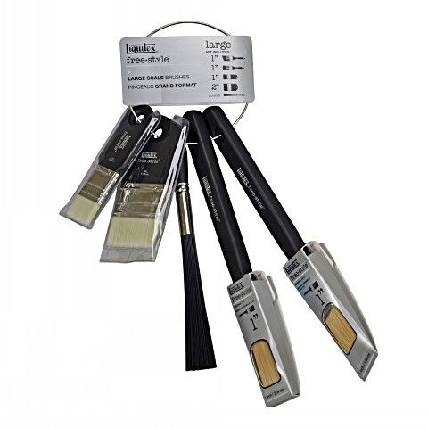 These sets feature brushes that have blended synthetic bristles with ideal snap and spring for acrylics. The bristles are secured to the handles with rustproof stainless steel ferrules. The traditional brushes have long, contoured bright green handles with a satin matte finish that provides extra comfort when holding the brush. They work well for fine detail work. Ideal for large paintings and murals, the large scale brush handles are made of seasoned hardwood sealed and lacquered with a black, satin matte finish that provides comfort and a non-slip grip. The brushed stainless steel rustproof ferrule is screwed and glued to handle for added durability. The large scale brushes also have holes the handles for easy storage and transport. The 5-brush large scale set includes a round splatter, a 1" flat, a 1" angle and 1" and 2" paddle brushes.