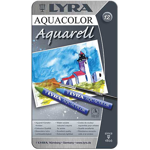 Aquacolor is a water-soluble wax crayon which suits the highest of creative demands. The highly lightfast and rich pigmentation of the crayons results in a very high color brilliancy. They are water-soluble and easy to blend, allowing an almost unlimited range of shades. Each set is packaged in a convenient metal box.