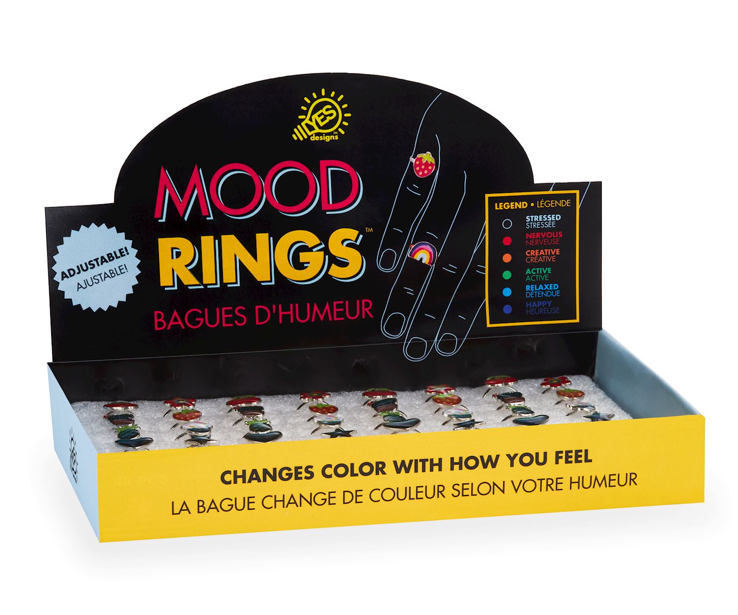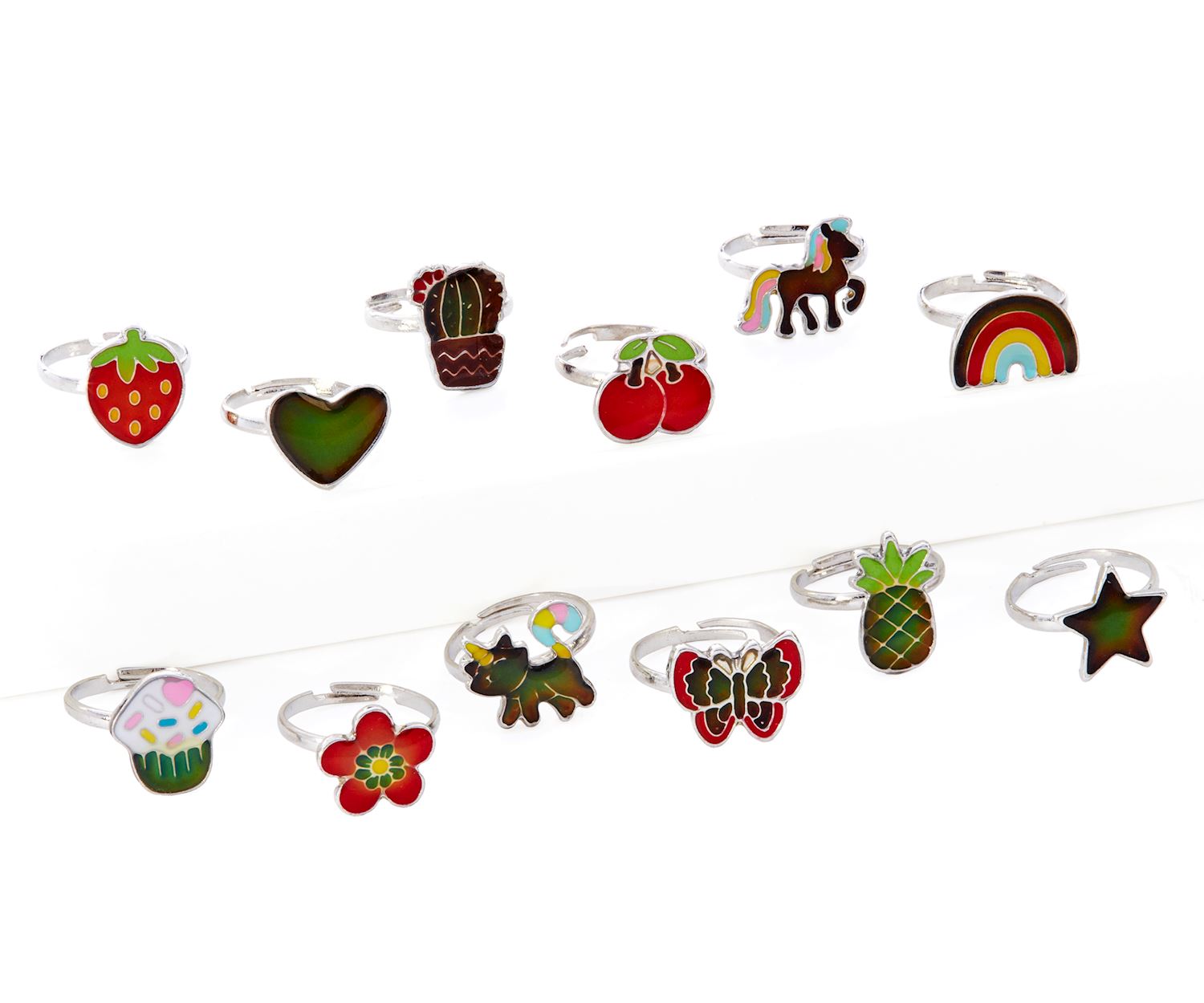 A great gift or a fun treat for yourself, this Mood Ring changes colors according to how you feel! With an adjustable metal ring and a colorful charm design, this mood ring can change into 6 different colors. Available in 12 assorted designs: Strawberry, Heart, Cupcake, Flower, Cactus, Unicorn, Cherries, Cat, Rainbow, Butterfly, Pineapple, and Star.