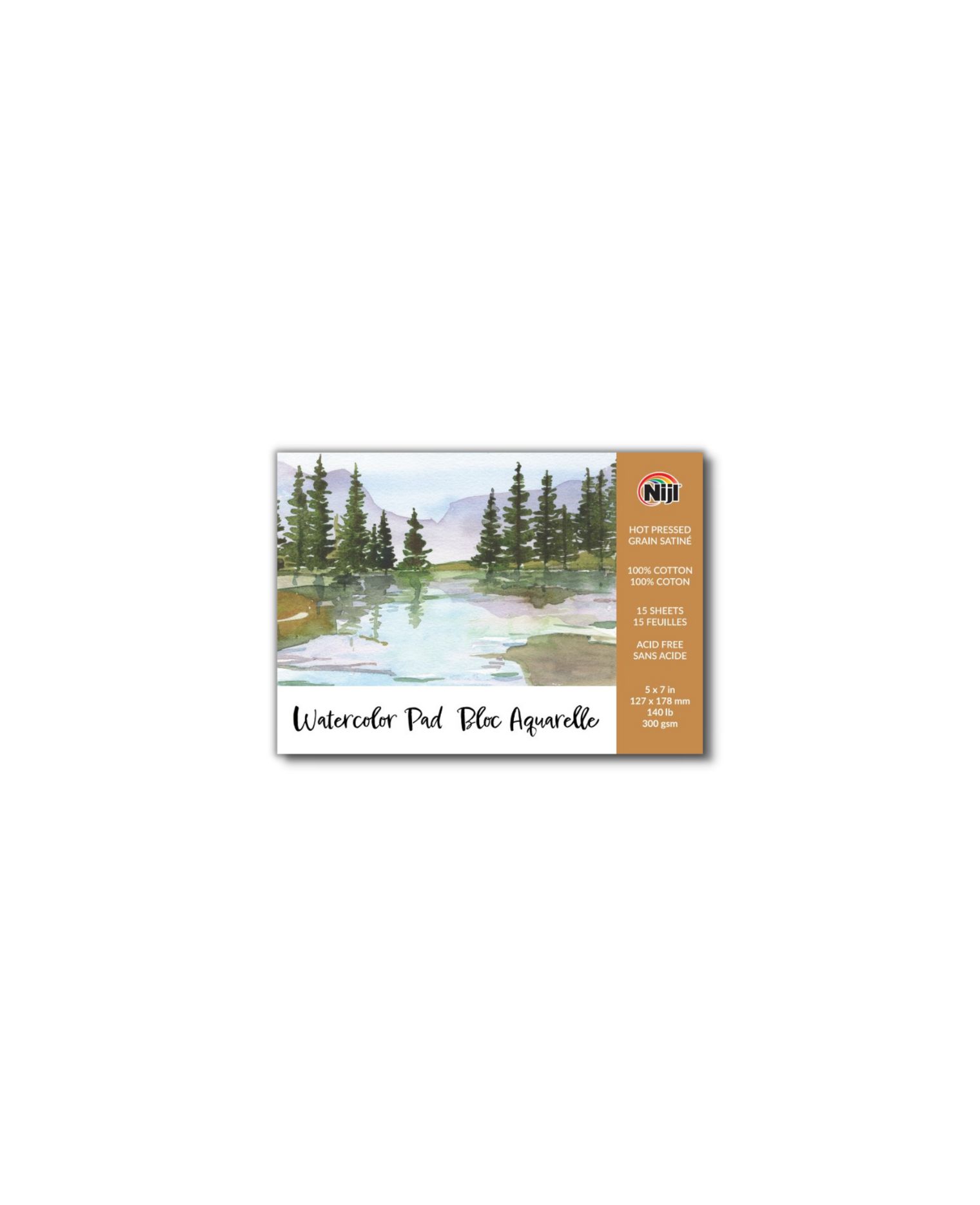 NHP-5 – Niji® Watercolor Paper Pad, Hot Press, 15 sheets Niji watercolor paper is made of 100% cotton fibers for high quality, performance, strength and stability. This bright white paper is acid-free, chlorine-free, and archival. It is internally and externally sized making it very absorbent and suitable for color lifting and other creative techniques. 100% cotton 15 sheets/pad Acid-free 5 x 7 inches 140 lb/300 gsm. Also available in cold press: NCP-5 – Niji® Watercolor Paper Pad, Cold Press, 15 Sheets