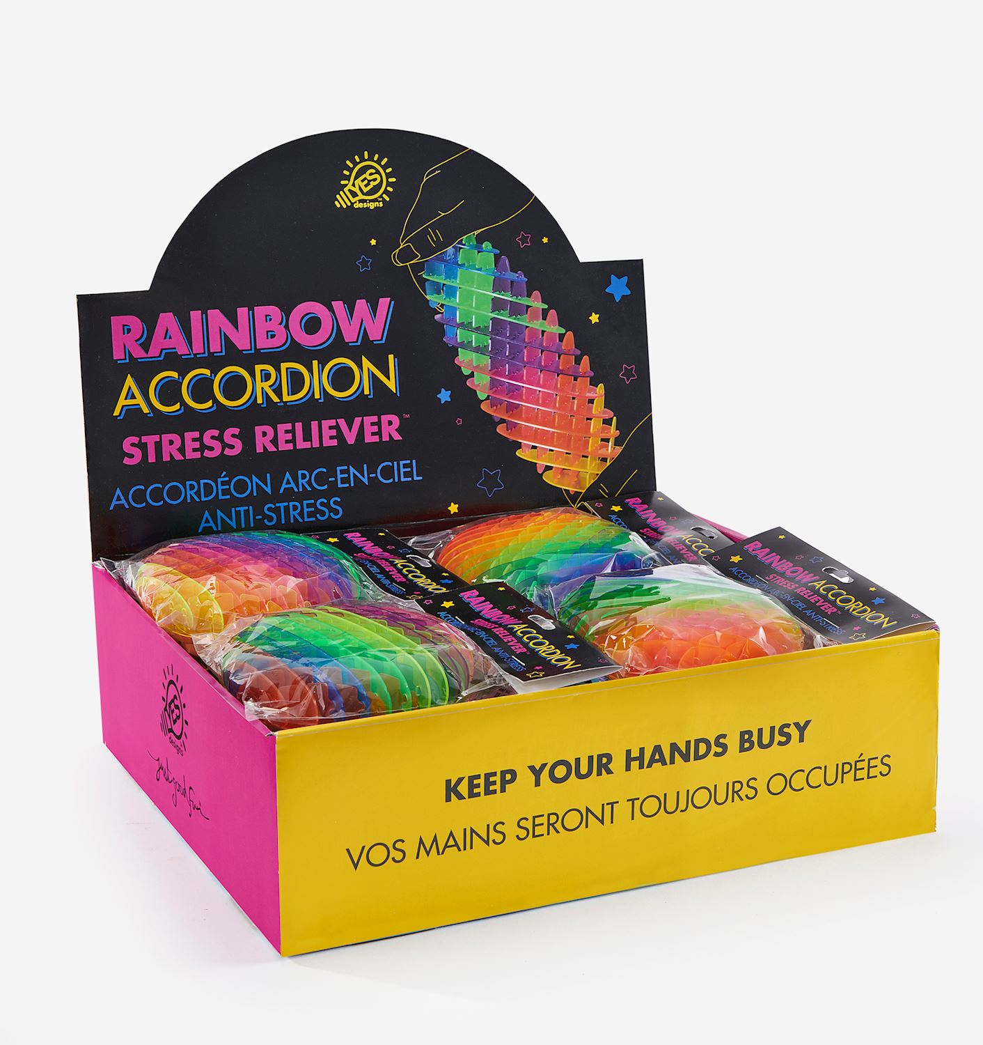Add a splash of color and a dose of relaxation to your day with this Rainbow Accordion Stress Reliever. This vibrant fidget toy is designed to keep your hands busy and your mind at ease. The unique accordion design provides a satisfying tactile experience, perfect for squeezing, stretching, and twisting. 18 pieces per cardboard displayer (13.5x12x13.5) at no extra cost. Polypropylene.
