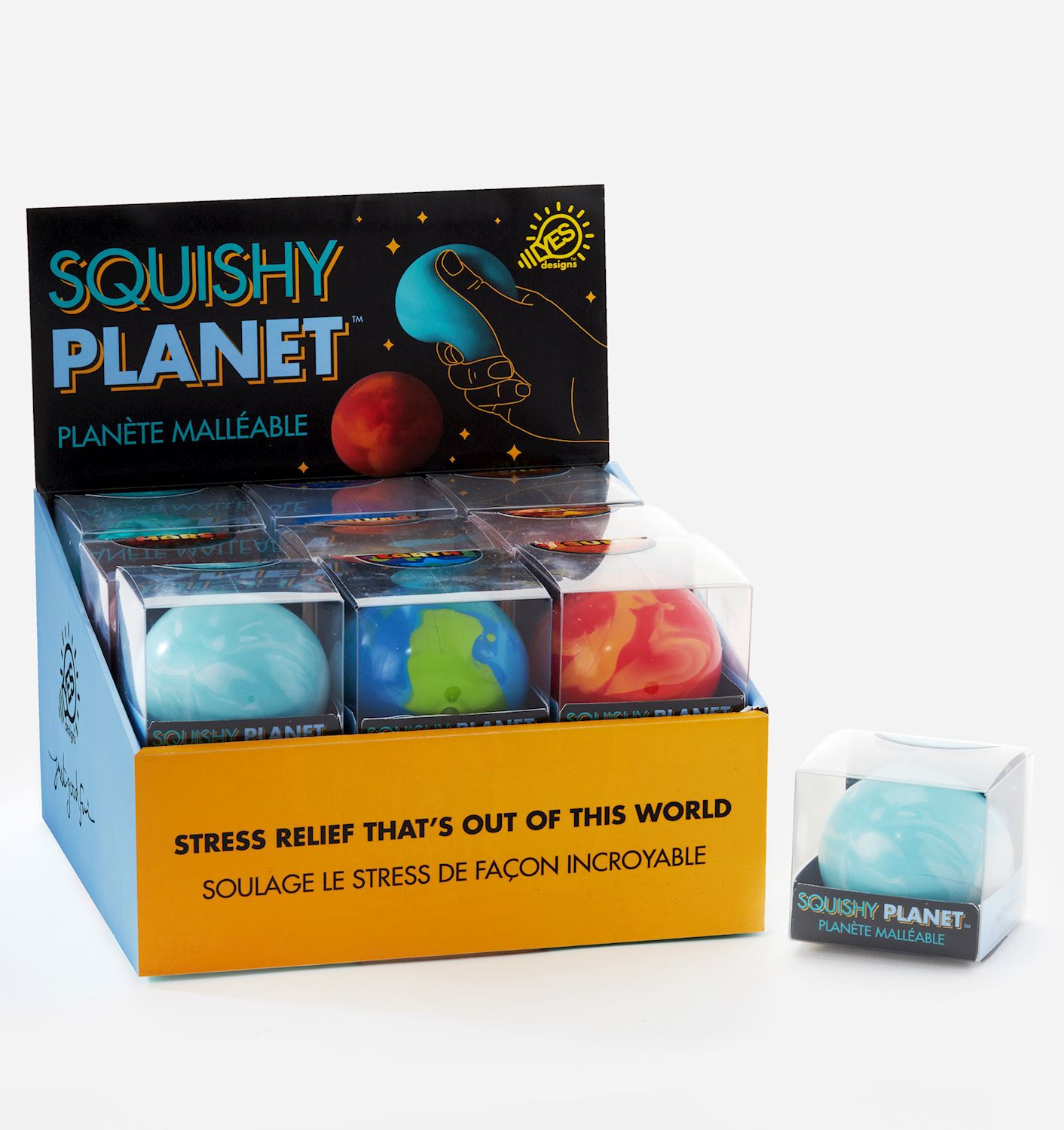 Take on the universe as you squeeze, squish, and melt the stress away with this Planet Squishy. Designed to be squeezed for a sensory relaxing experience, this planet squishy is perfect for both children and adults with a cosmic fascination and features a colorful planet design with the ultimate squooshy feel. Comes packaged in a gift box. Available in 9 assorted styles.