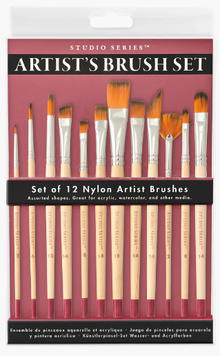 Set of 12 brushes includes a versatile range of shapes and sizes for fine detail work, broad-area coverage, and texturing.